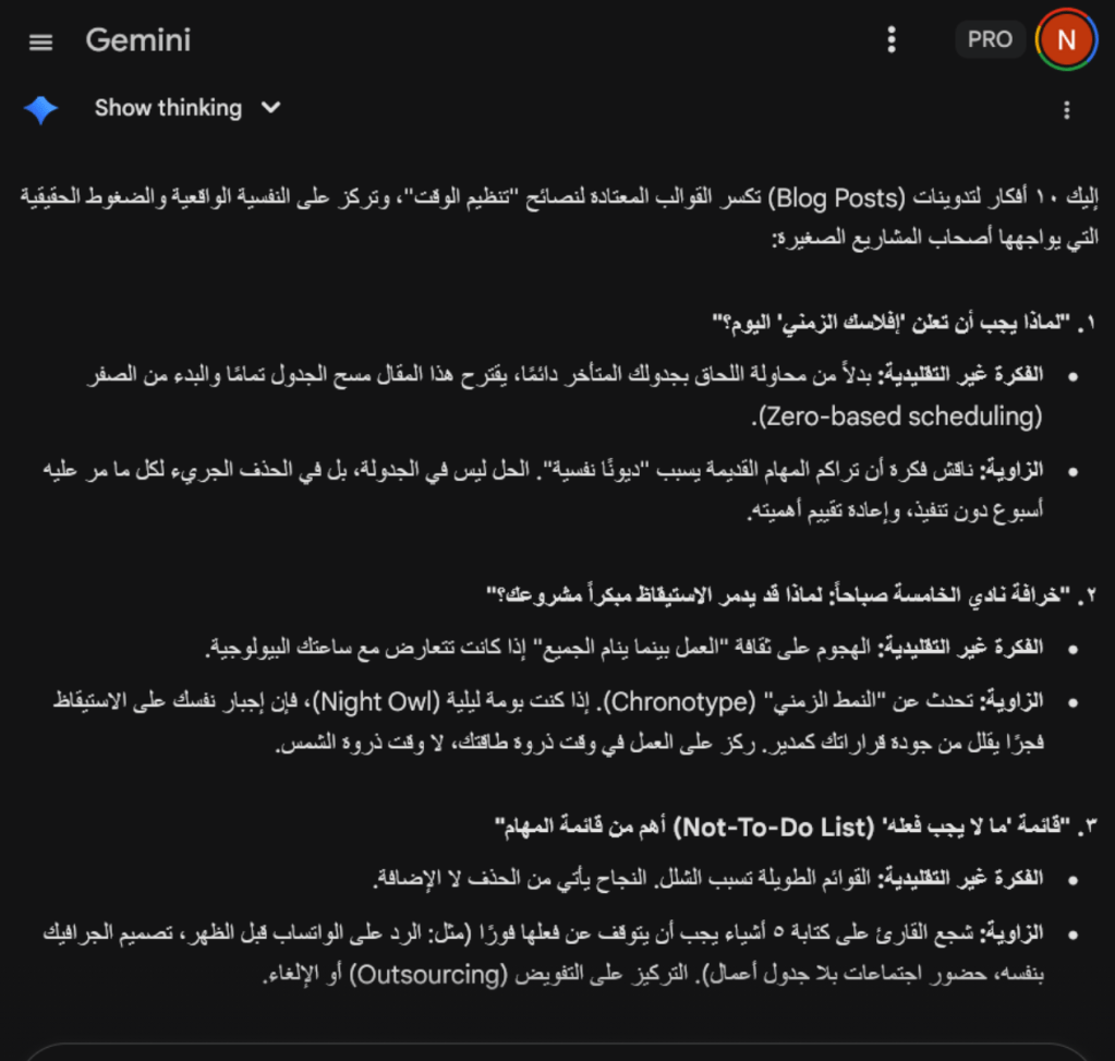- عصف ذهني: “أعطيني 10 أفكار لتدوينات غير تقليدية عن إدارة الوقت لأصحاب المشاريع”.
